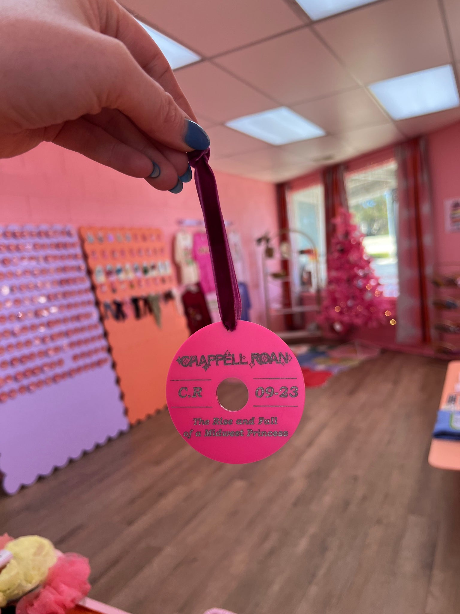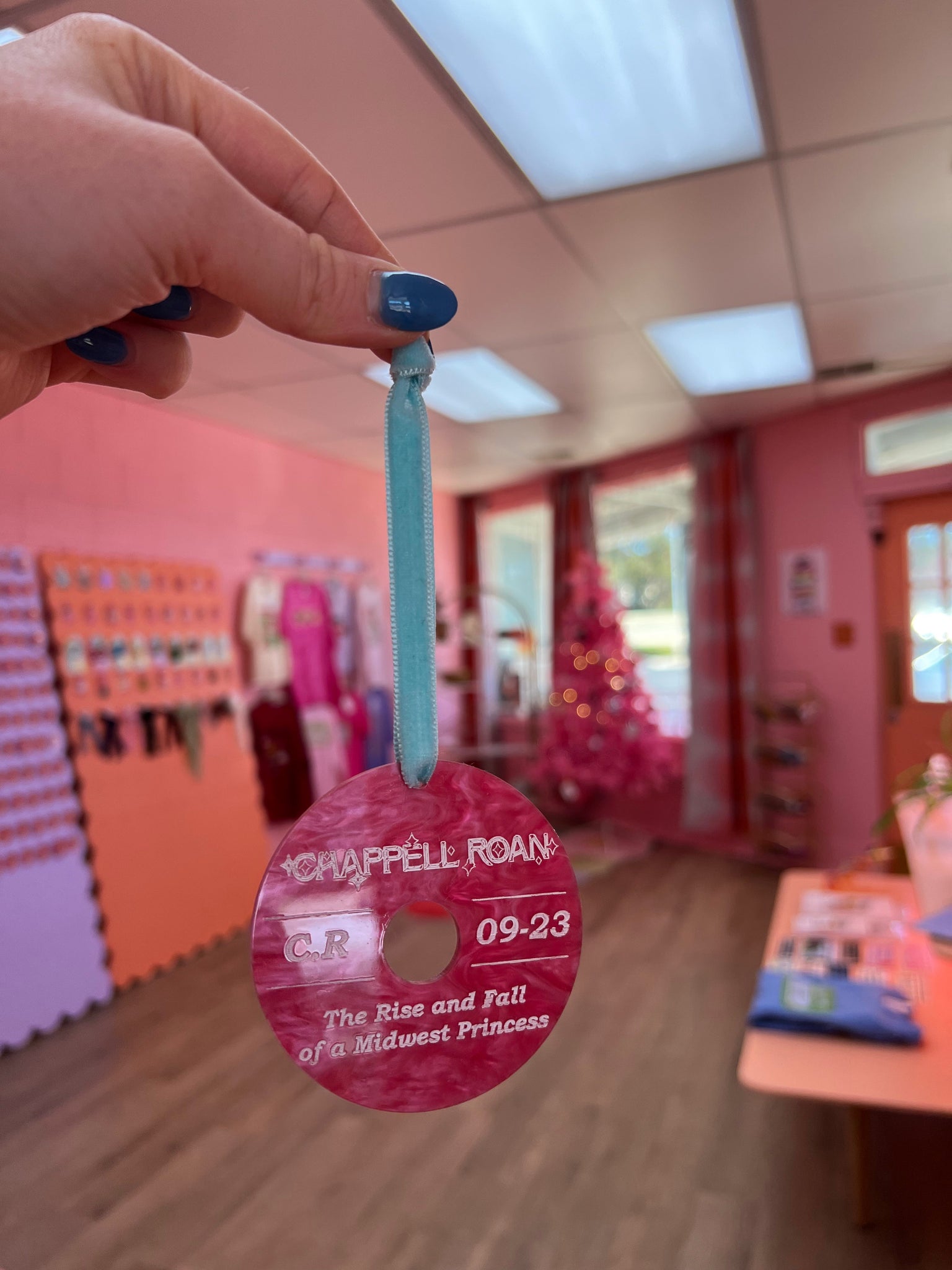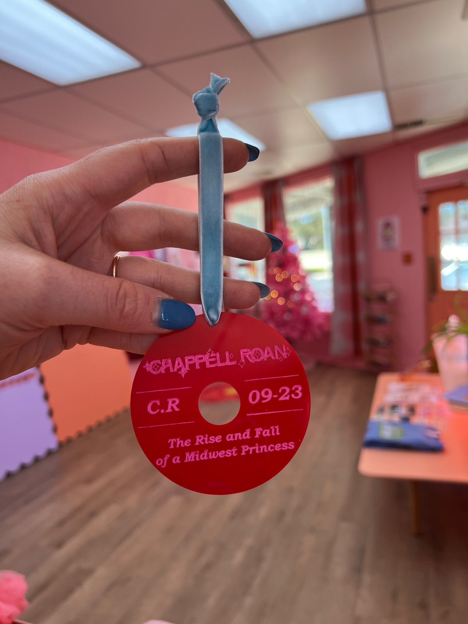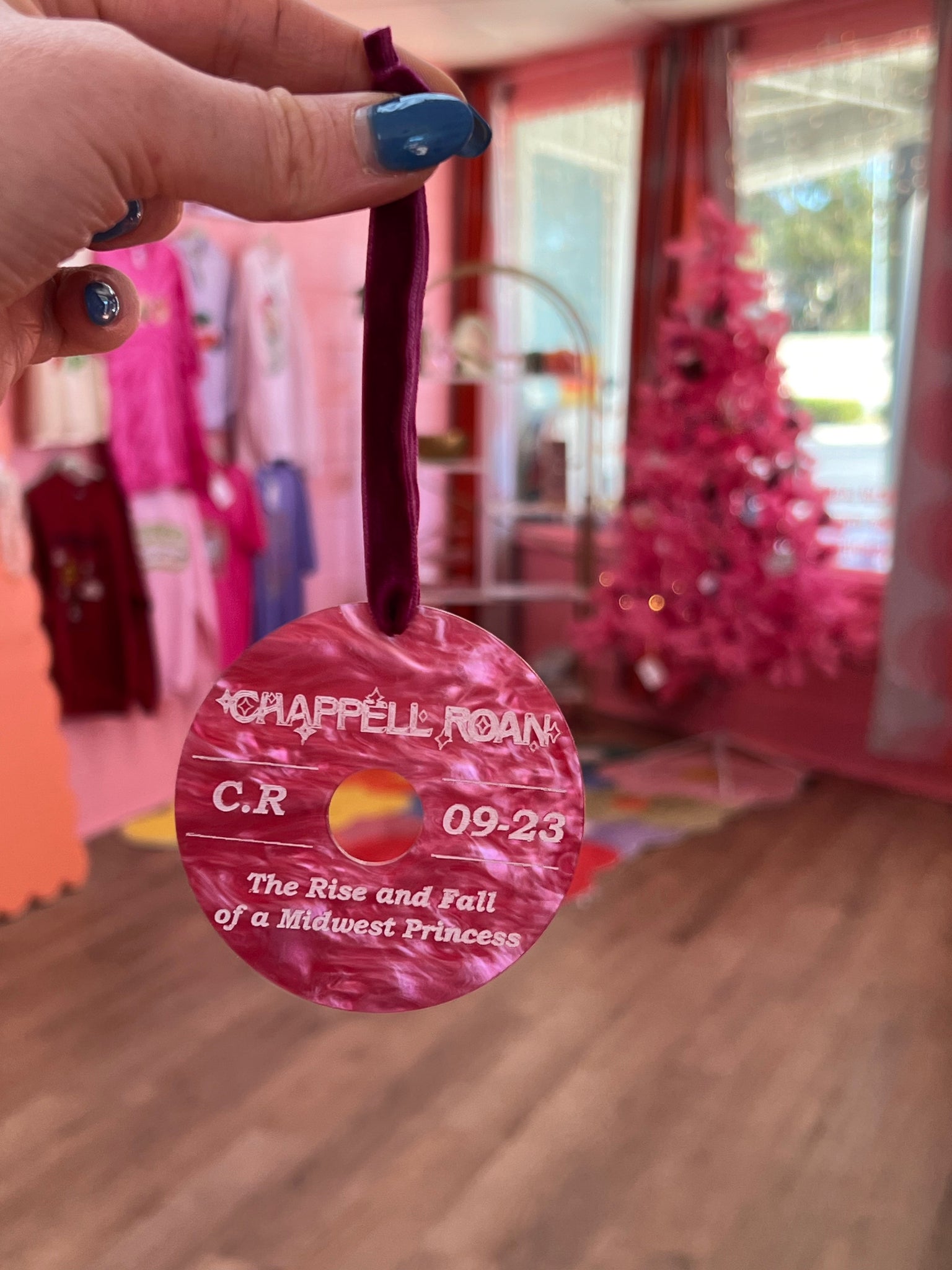Experience the magic of Chappell Roan's album with our hand-painted ornament! Featuring the album title, name, initials, and release month, this 3" round ornament is perfect for any fan. Hang it on your tree or display it year-round to show your love for this talented artist.