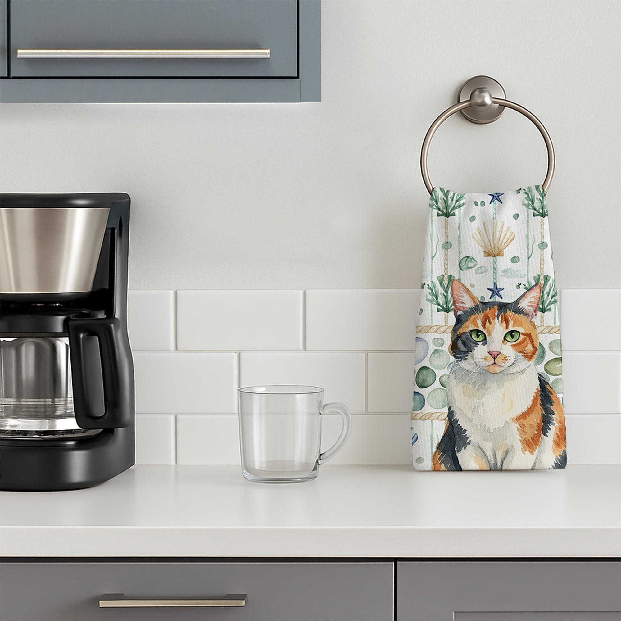 Kitchen Towel featuring breed specific Calico artwork. Bring cozy everyday charm to your sink or powder room with a plush velour towel featuring original watercolor artwork. The front is a soft, color-rich minky polyester that polishes glassware to a brilliant shine; the back is 100% white cotton terry loop for quick absorbency on hands, dishes, and counters. Artwork is dyed into the fibers for lasting color that won’t crack or peel. Finished edges keep the shape wash after wash. Size: 15" x 25". Machine wash; tumble dry low. Designed and printed in the USA.