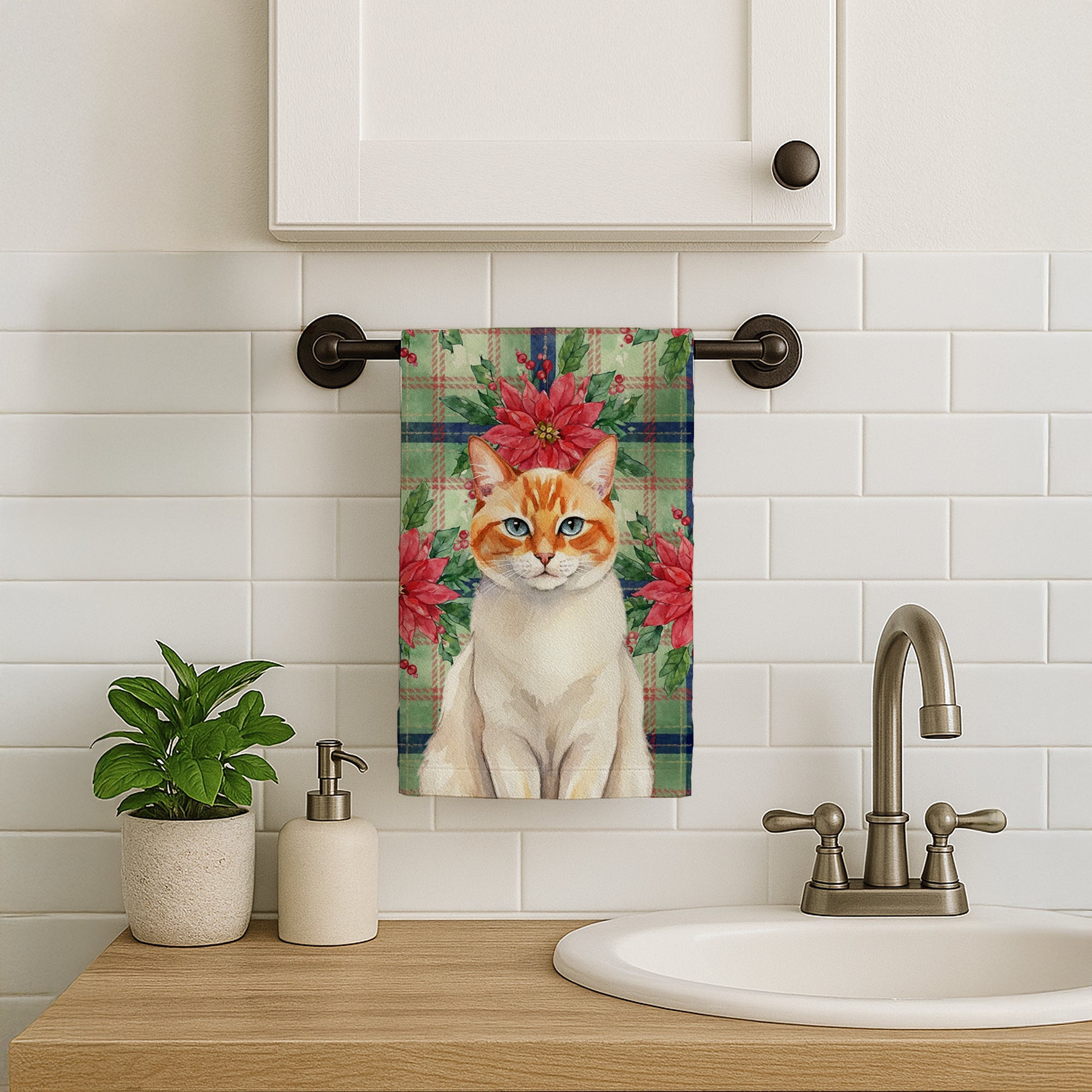 Kitchen Towel featuring breed specific Flame Point artwork. Celebrate Christmas with this Christmas Kitchen Towel. Bring cozy everyday charm to your sink or powder room with a plush velour towel featuring original watercolor artwork. The front is a soft, color-rich minky polyester that polishes glassware to a brilliant shine; the back is 100% white cotton terry loop for quick absorbency on hands, dishes, and counters. Artwork is dyed into the fibers for lasting color that won’t crack or peel. Finished edges keep the shape wash after wash. Size: 15" x 25". Machine wash; tumble dry low. Designed and printed in the USA.