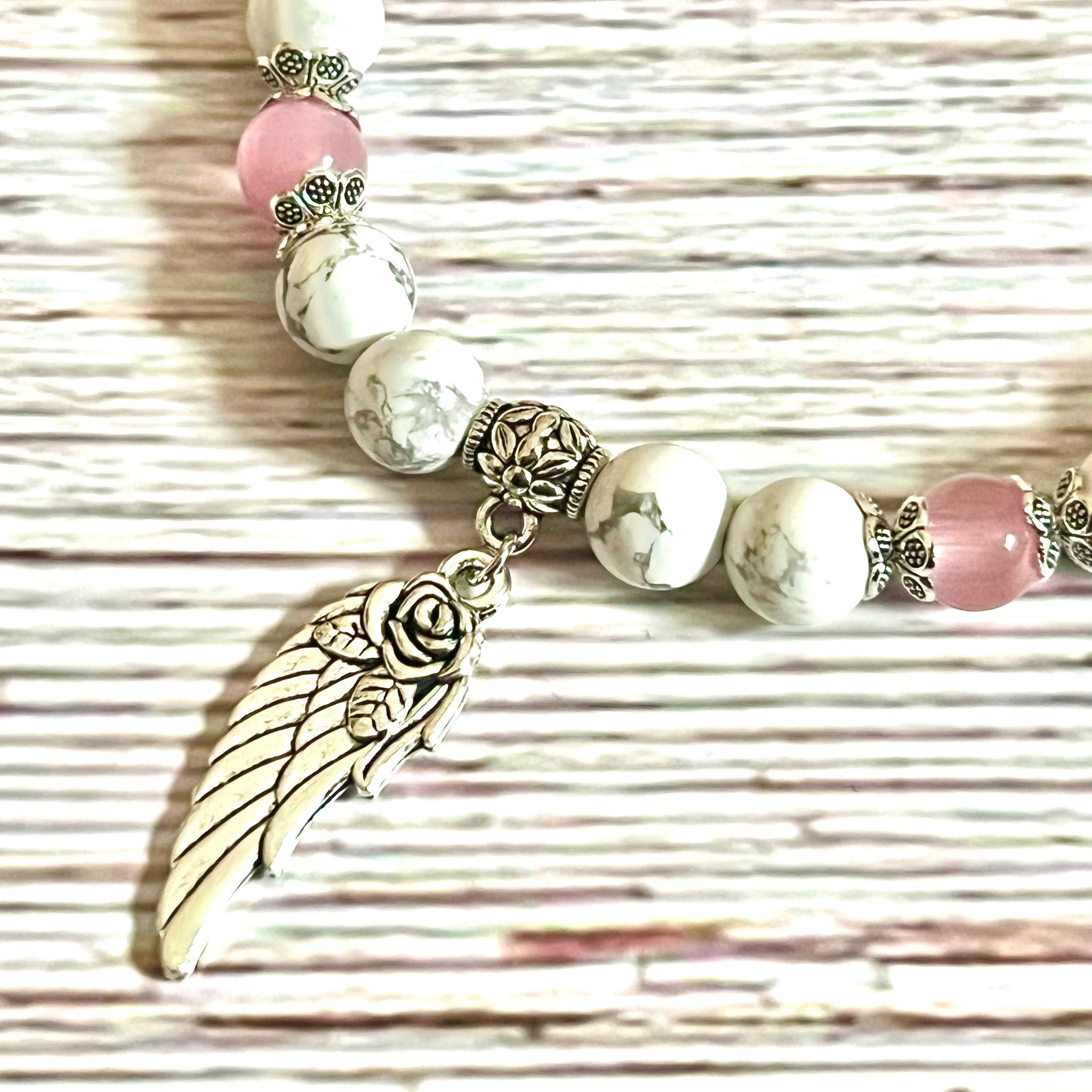 This beautiful crystal bracelet is really something special. It's made from Pink Cat Eye - the stone of luck and White Turquoise - the stone of bliss and optimism, accentuated with an angel wing charm to remind you your guardian angel is always near.