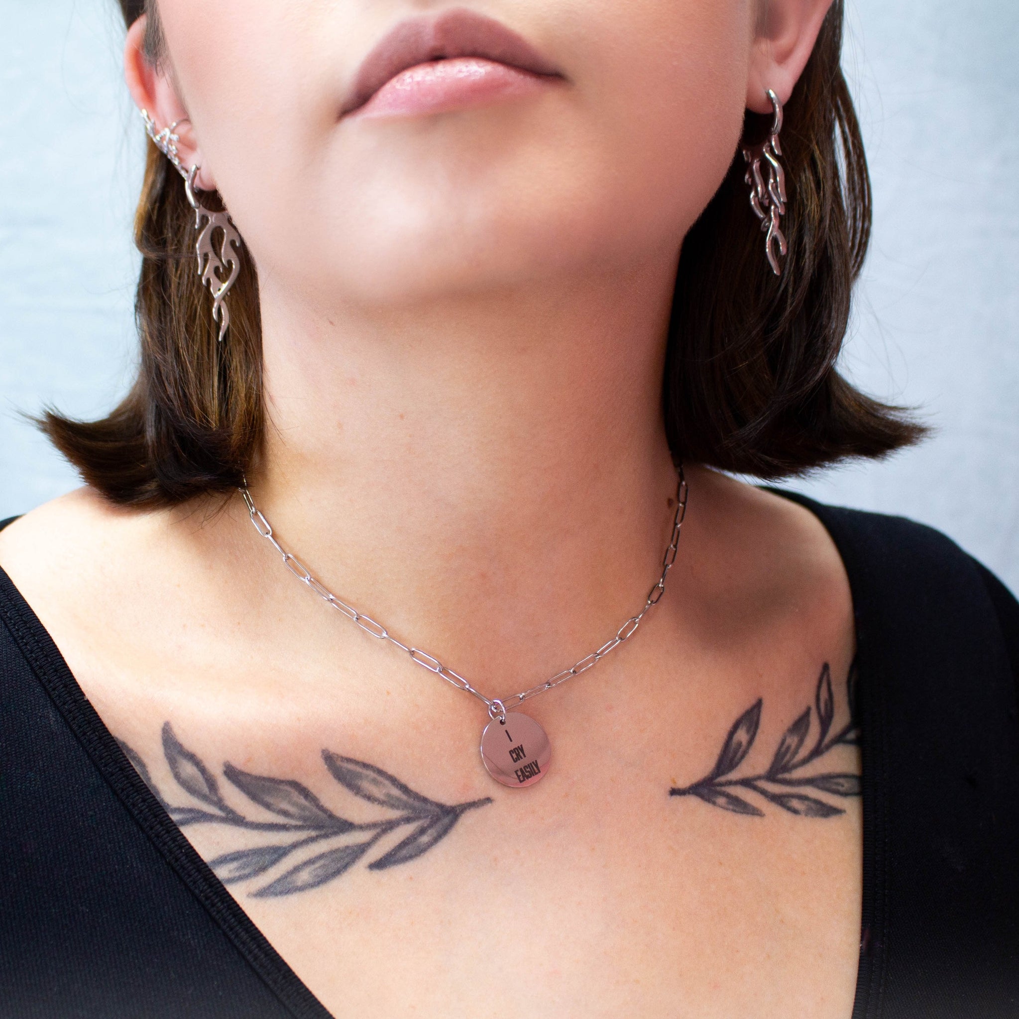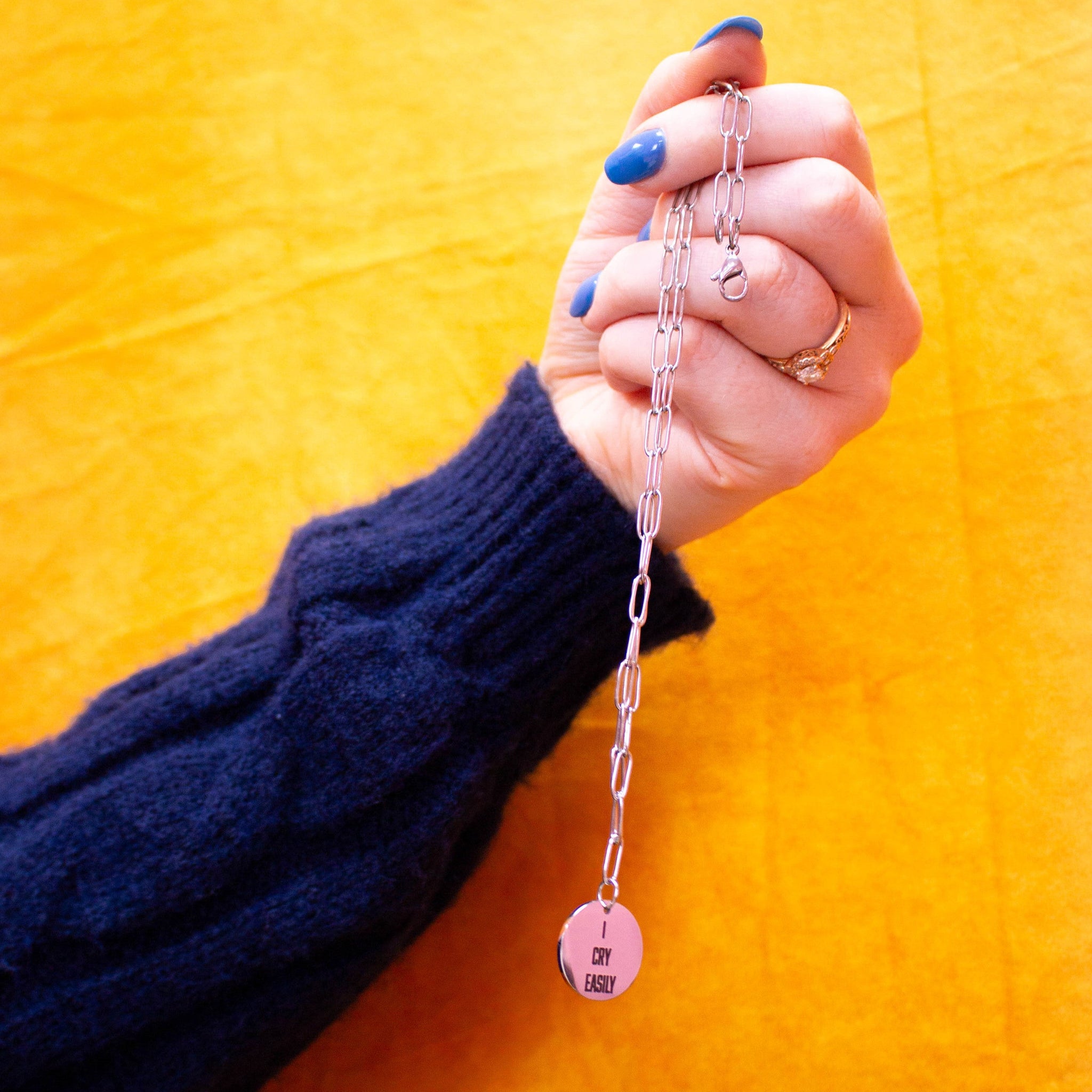 This necklace is not afraid to show its emotions. The "i cry easily" charm is engraved into durable stainless steel, perfectly paired with a titanium chain. Wear it proudly as a reminder to embrace your sensitive side. Goes great with waterproof mascara.