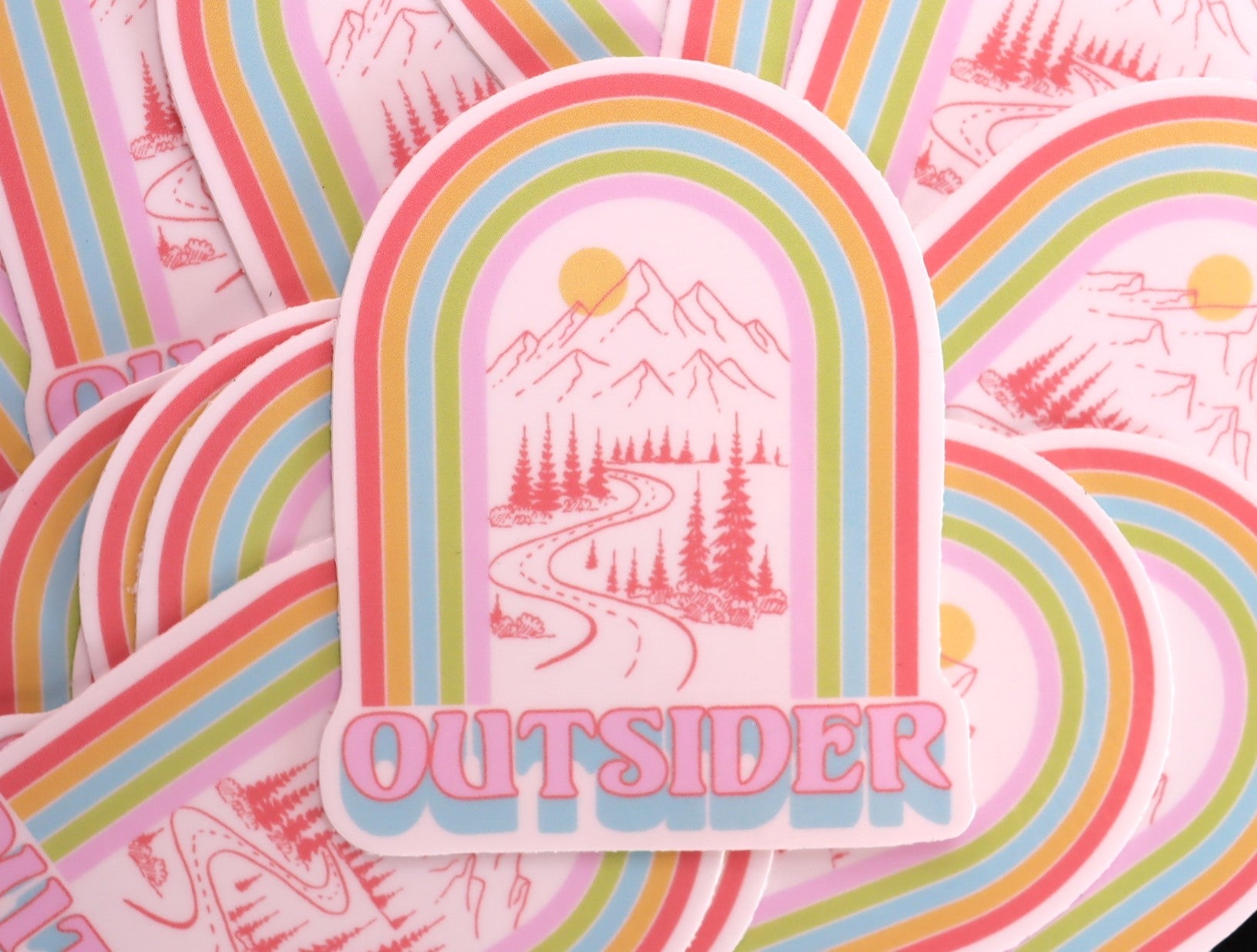 Add some retro flair to your life with our "Outsider" sticker! Featuring a pastel rainbow and nature scene, this sticker is sure to add a playful touch to any surface. Show off your quirky side and stick it anywhere for a pop of color and fun.