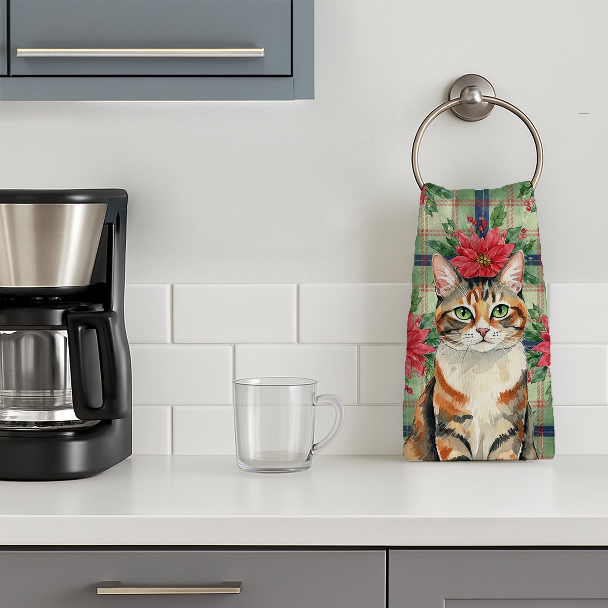 Kitchen Towel featuring breed specific Patched Tabby artwork. Celebrate Christmas with this Christmas Kitchen Towel. Bring cozy everyday charm to your sink or powder room with a plush velour towel featuring original watercolor artwork. The front is a soft, color-rich minky polyester that polishes glassware to a brilliant shine; the back is 100% white cotton terry loop for quick absorbency on hands, dishes, and counters. Artwork is dyed into the fibers for lasting color that won’t crack or peel. Finished edges keep the shape wash after wash. Size: 15" x 25". Machine wash; tumble dry low. Designed and printed in the USA.