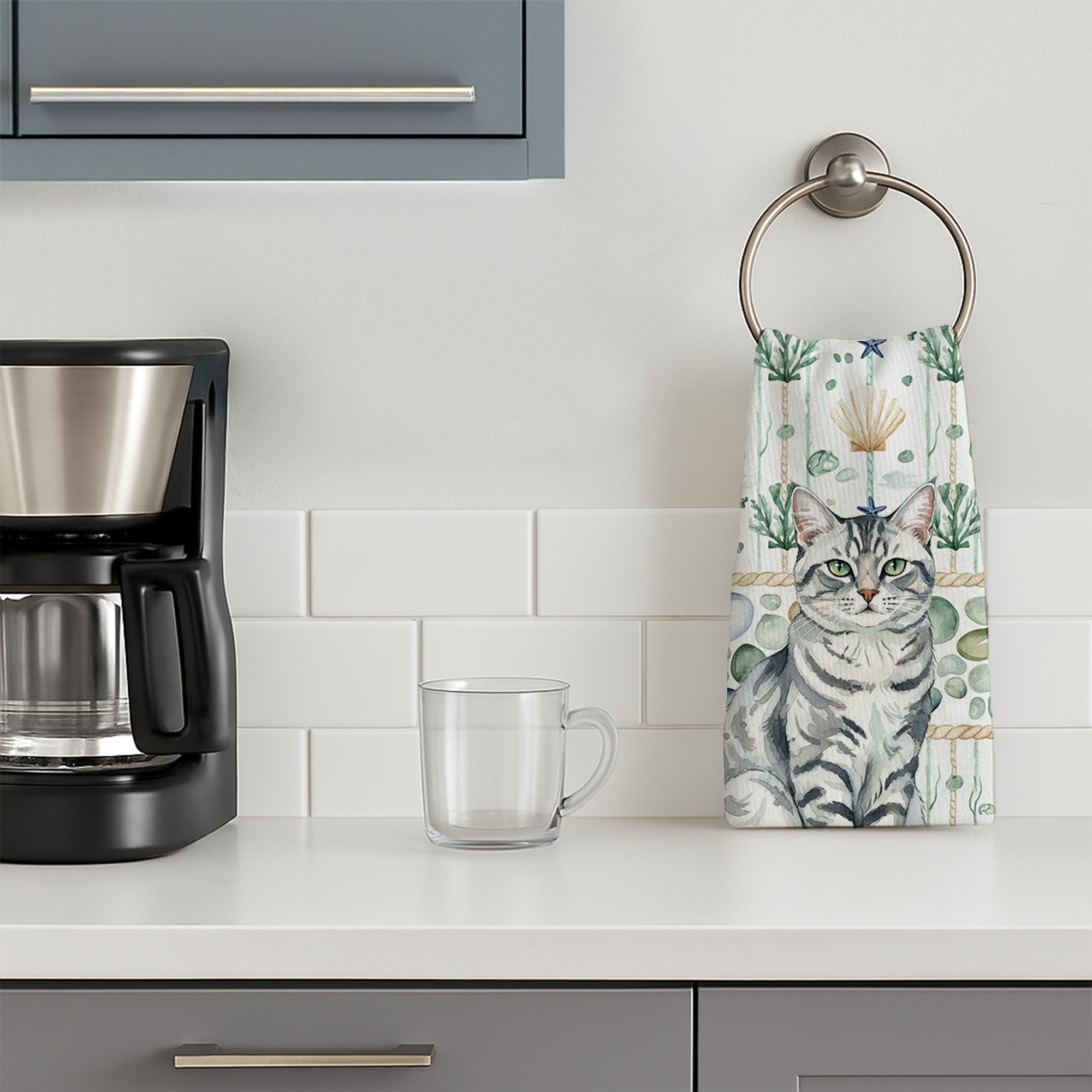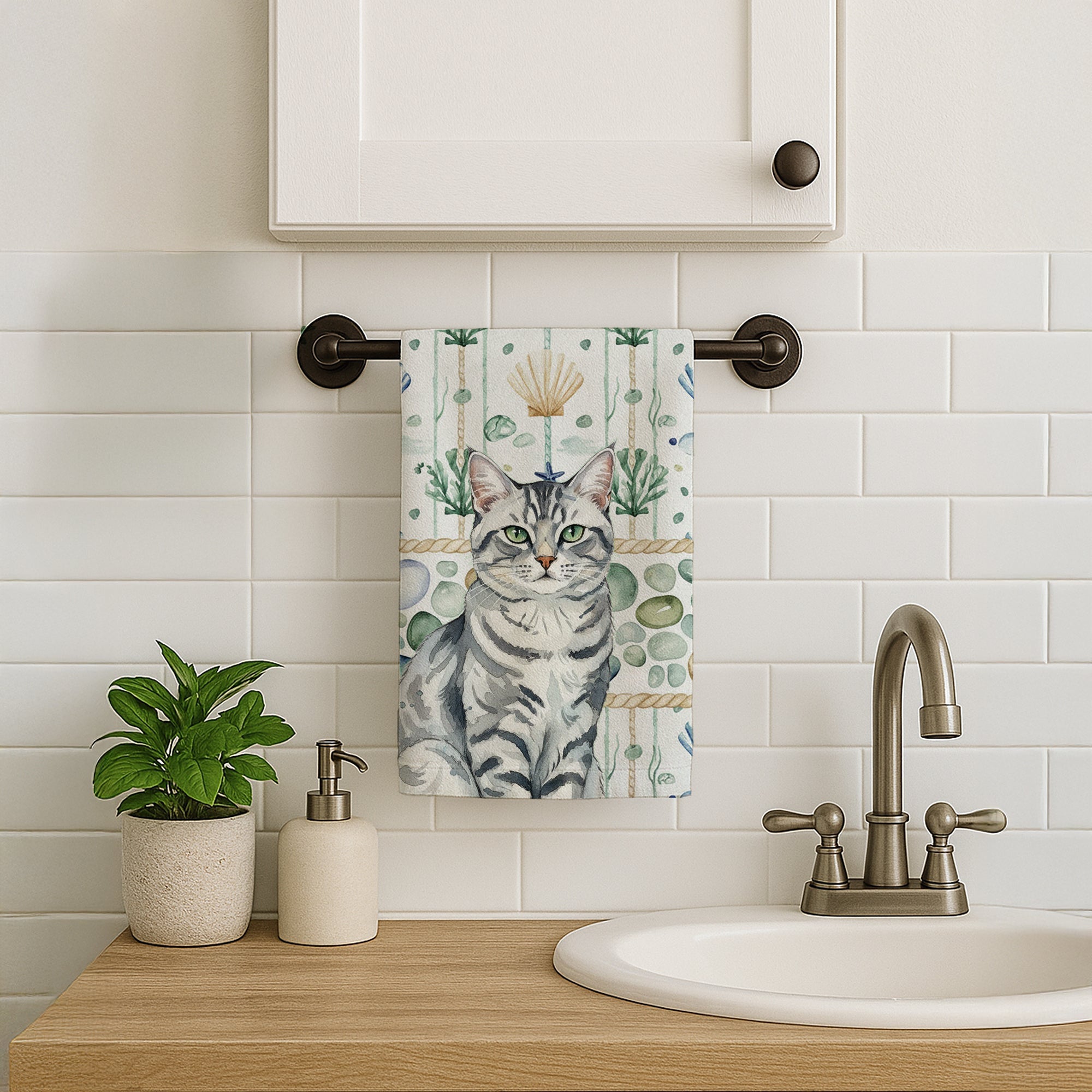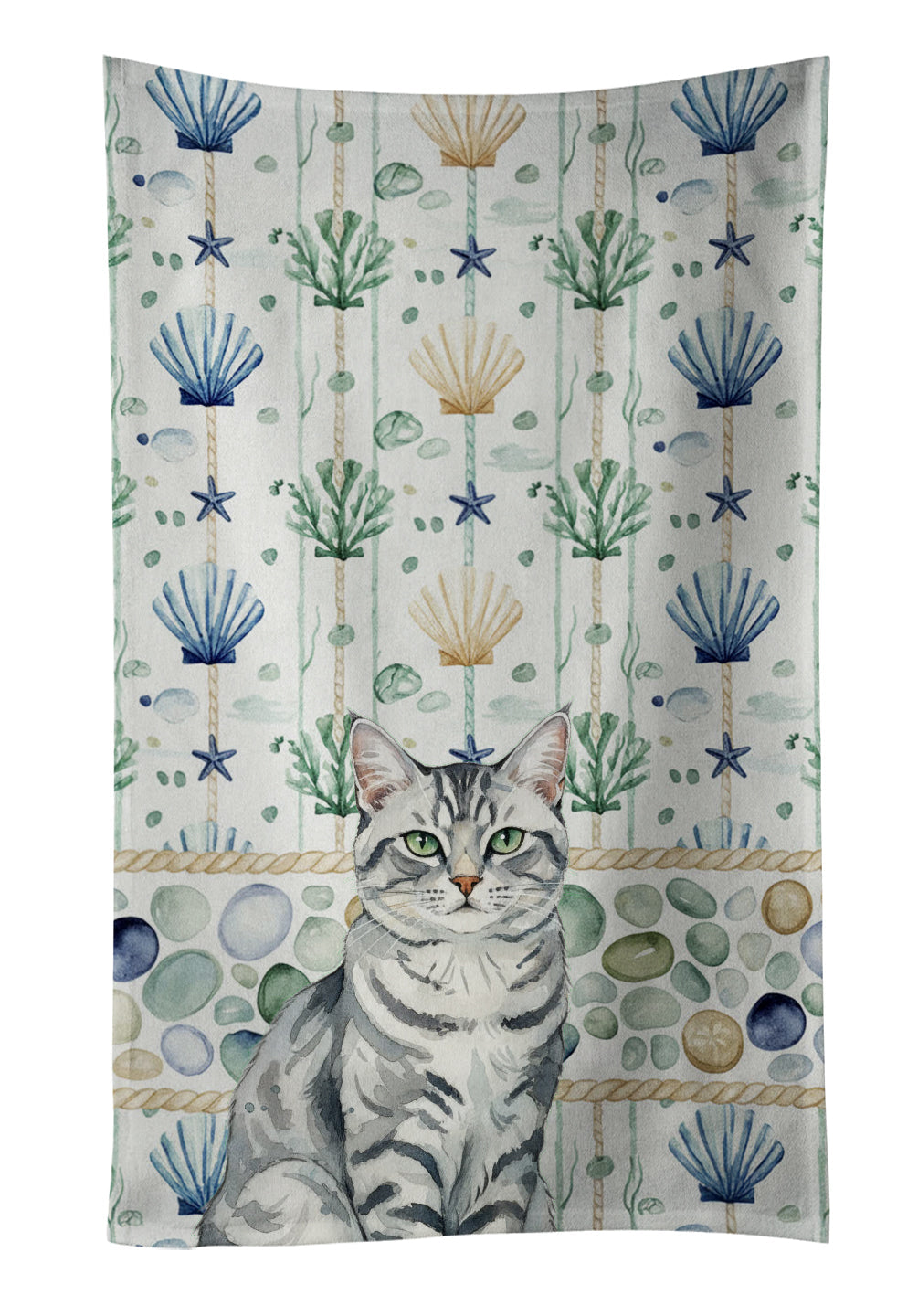 Kitchen Towel featuring breed specific Silver Classic Tabby artwork. Bring cozy everyday charm to your sink or powder room with a plush velour towel featuring original watercolor artwork. The front is a soft, color-rich minky polyester that polishes glassware to a brilliant shine; the back is 100% white cotton terry loop for quick absorbency on hands, dishes, and counters. Artwork is dyed into the fibers for lasting color that won’t crack or peel. Finished edges keep the shape wash after wash. Size: 15" x 25". Machine wash; tumble dry low. Designed and printed in the USA.